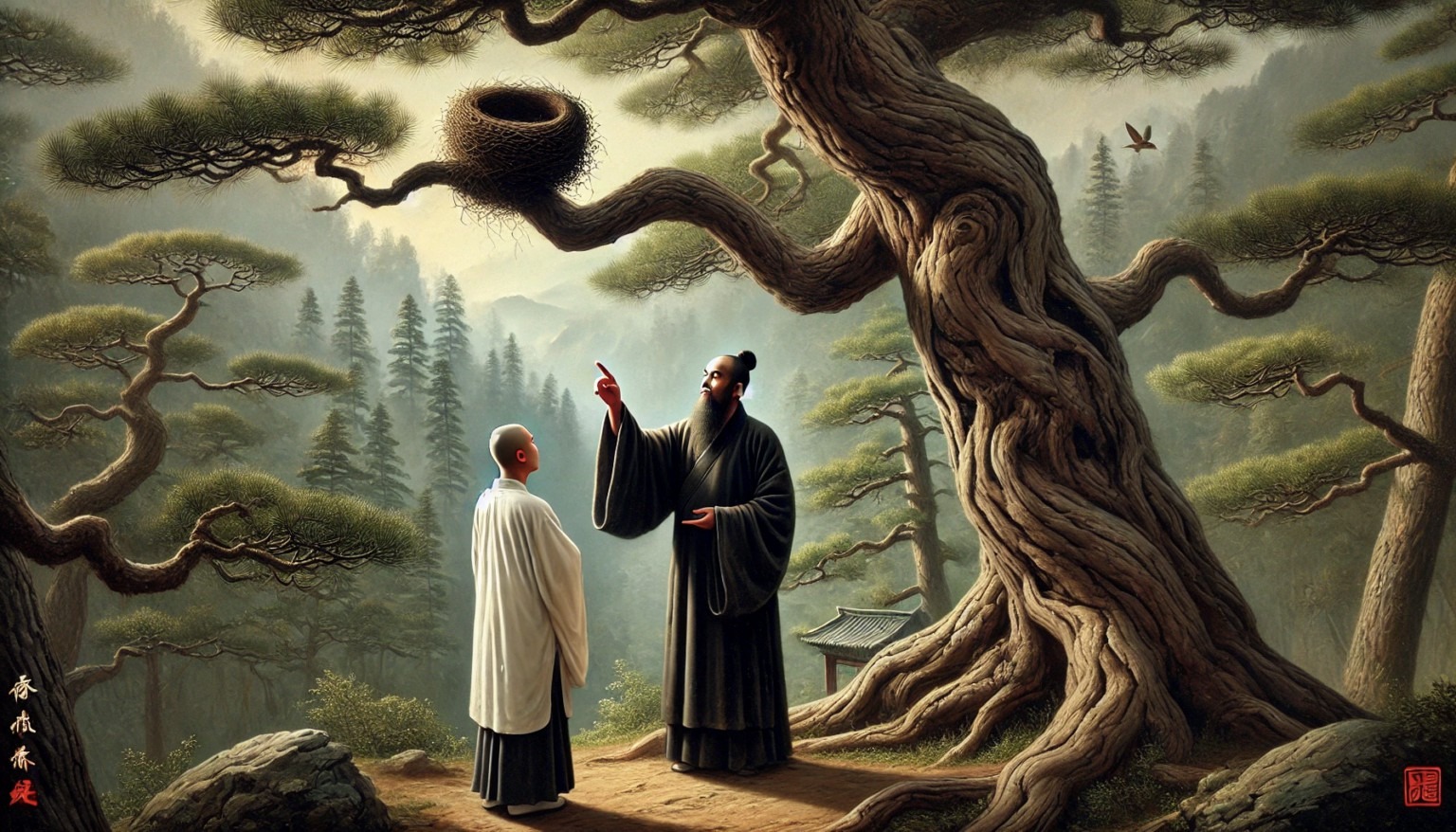 黄檗指着树上的鸟巢,说:“鸟巢虽在风中,鸟是否因此失眠?”