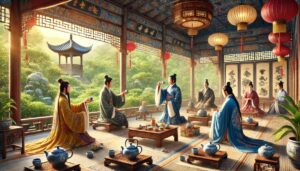 茶道礼仪不仅规范了茶的冲泡与饮用方式,还体现了唐代社会秩序和人际交往的规则。在正式场合,奉茶需用双手,表达敬意;品茶时讲求谦逊,不可贪杯;茶具的摆放亦有规矩,彰显礼仪之美。