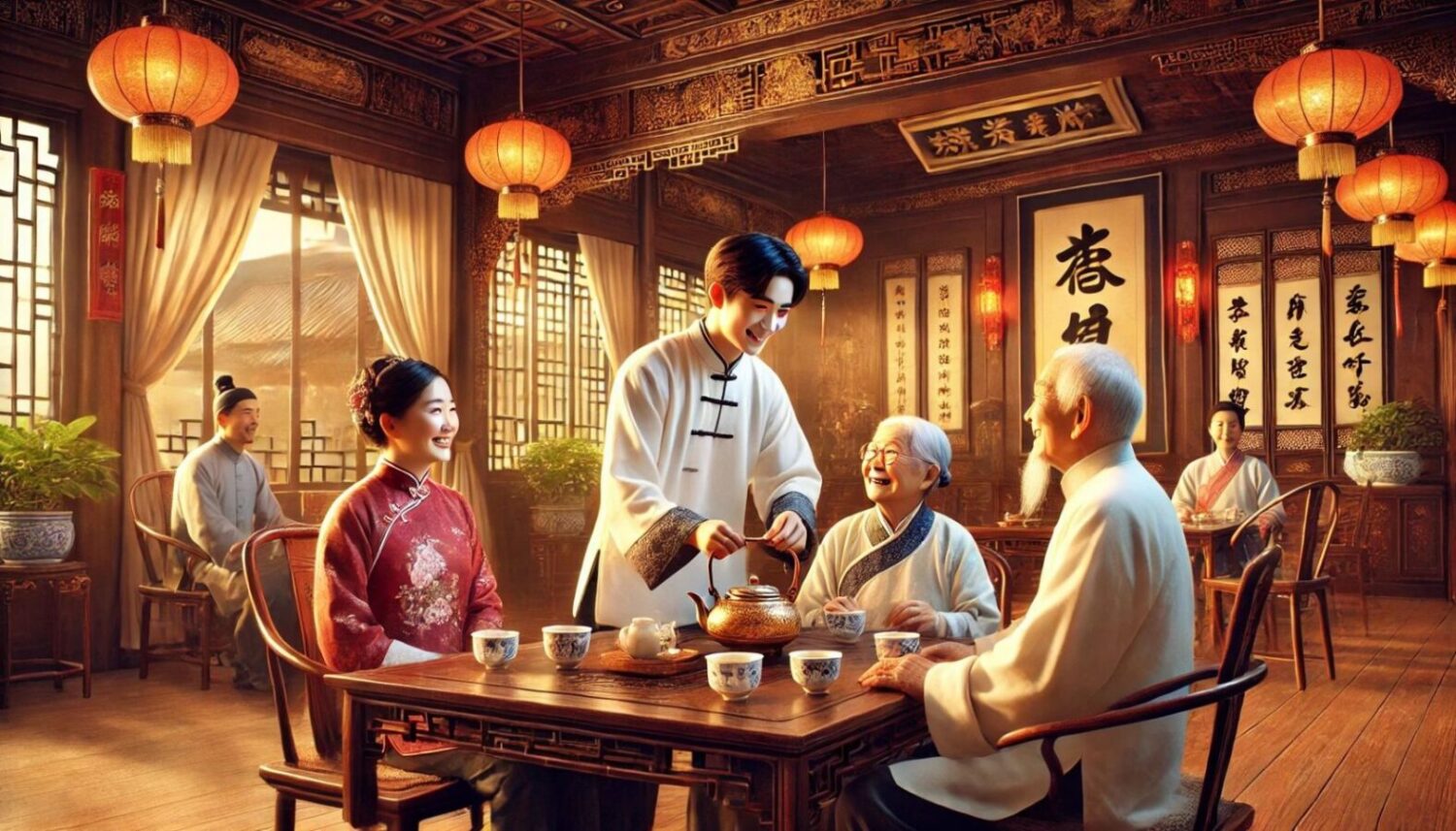 在古代,无论是家族聚会还是正式场合,晚辈向长辈敬茶是基本的礼节。这种习俗至今仍广泛流传于社会各个层面,尤其是在传统节日、家庭聚会、拜师仪式和重要庆典中,茶始终扮演着尊长敬贤的媒介,成为维系人际关系和弘扬伦理道德的重要桥梁。