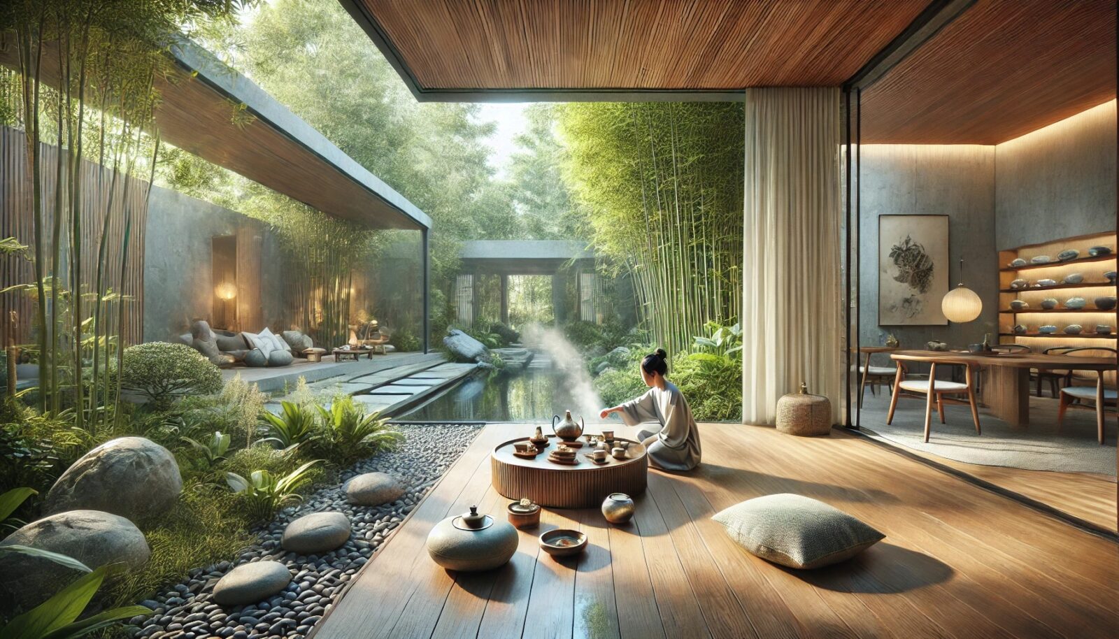 中式禅意风:采用木质茶桌、素雅茶具,搭配竹帘、绿植、书画,营造宁静淡泊的氛围。