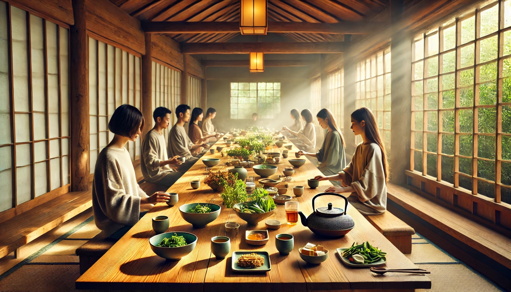 茶道的极简、斋食的清净、禅意的宁静三者结合,使人在此空间内得到专注、觉察与内在能量的滋养。适当的环境布置,如 简约的茶具、木质家具、天然光线、绿植,能够营造更舒适的氛围,使人在这个空间中感受到安定与平衡。
