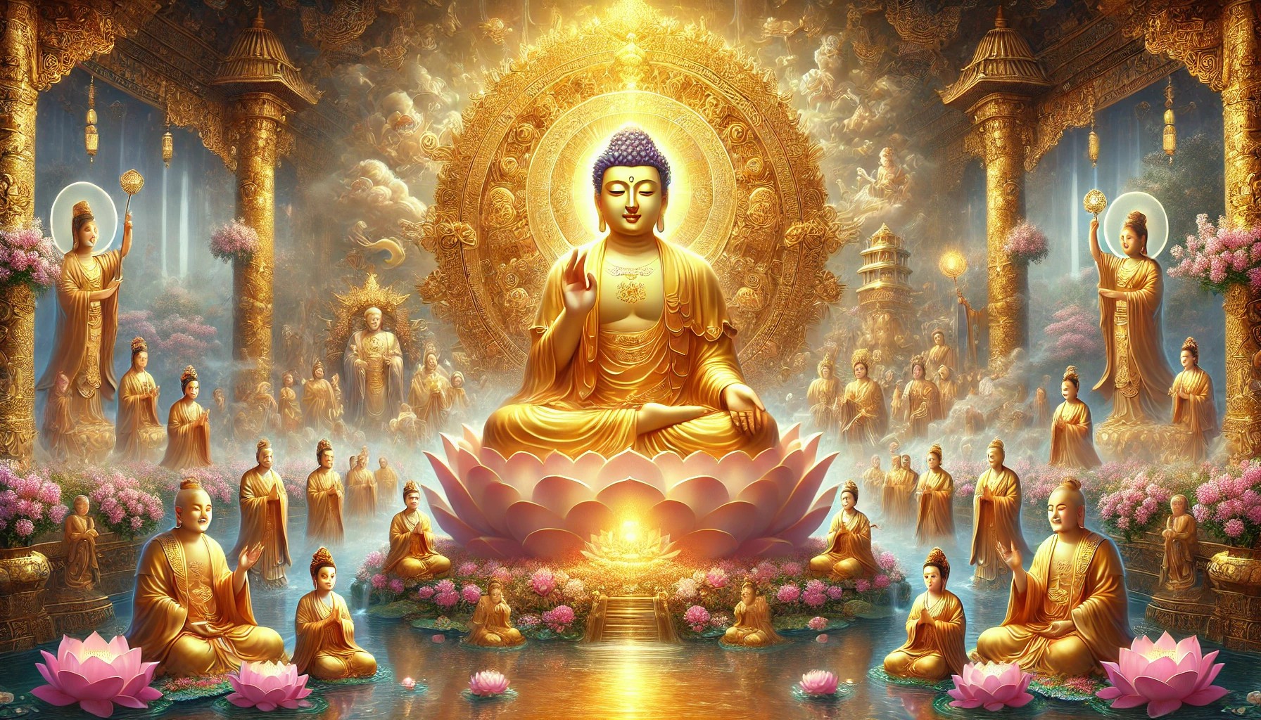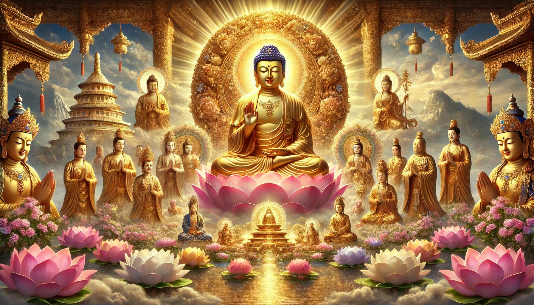 When such an aspirant is about to die, Amitayus, together with Avalokiteshvara, Mahasthamaprapta and a host of attendants, come to welcome him, bringing a golden lotus-flower and manifesting five hundred transformed Buddhas. Those transformed Buddhas extend their hands all at once and praise the aspirant, saying, ”Son of the Dharma, since you have awakened pure aspiration for the highest Enlightenment, we have come to welcome you.”