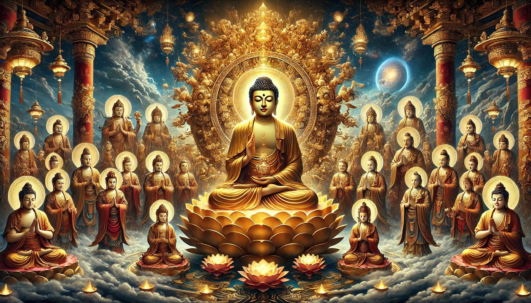 “The first great vow: I vow that in the future, when I attain unsurpassed complete enlightenment, my body will shine forth brilliant rays, illuminating infinite, countless, boundless realms. Endowed with Thirty-two Marks of the Great One and Eighty Auspicious Characteristics, I can enable all sentient beings to become just like me.