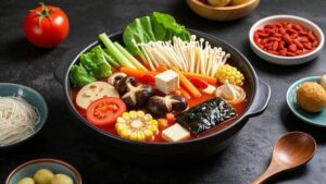 This is a flavorful and nutritious plant-based hot pot with a naturally rich tomato broth, paired with a variety of vegetables and tofu, making it a comforting and satisfying vegan meal.